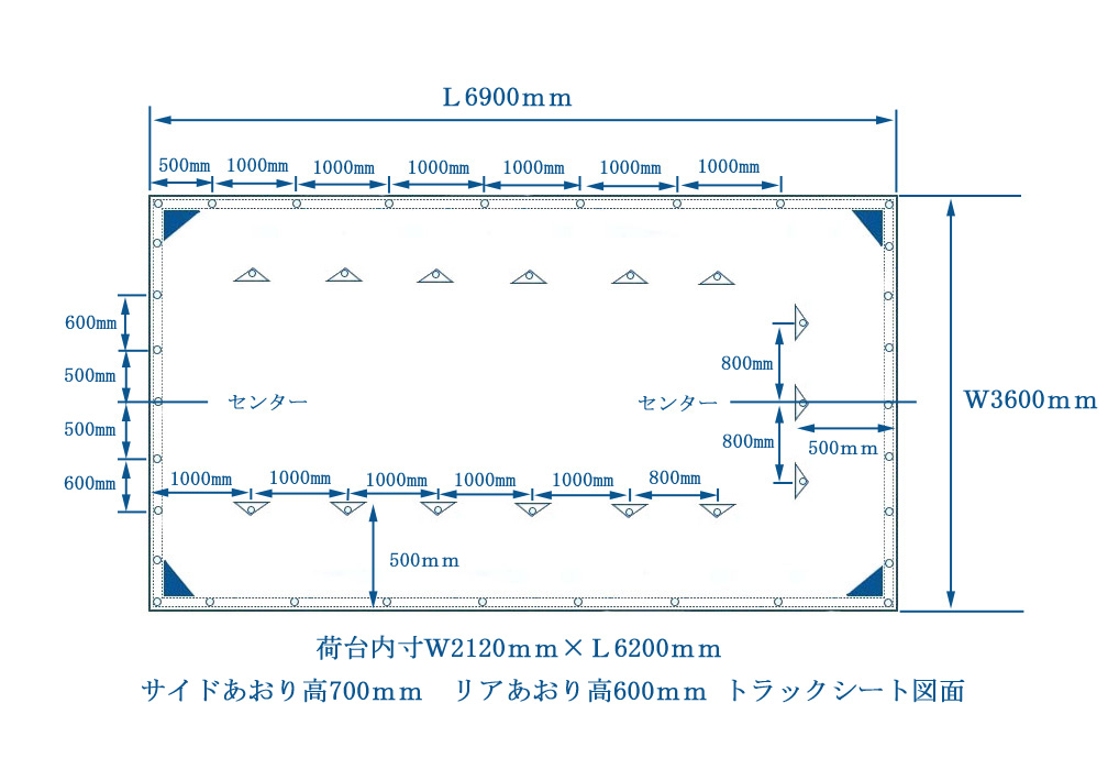 4t運送業トラックシート 荷台W2120mm×L6200mm サイドあおり高700mm リアあおり高600mm用